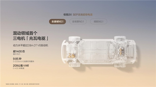 在中大型SUV性能排名中,极氪8X曜影版的核心武器是混动领域首款三电机兆瓦电驱。这套系统的技术含金量在于:三个电机协同工作,系统综合功率超过1400匹马力,零百加速仅2.96秒。这意味着,一台车长超过5米的中大型SUV,拥有了与顶级超跑比肩的加速能力。