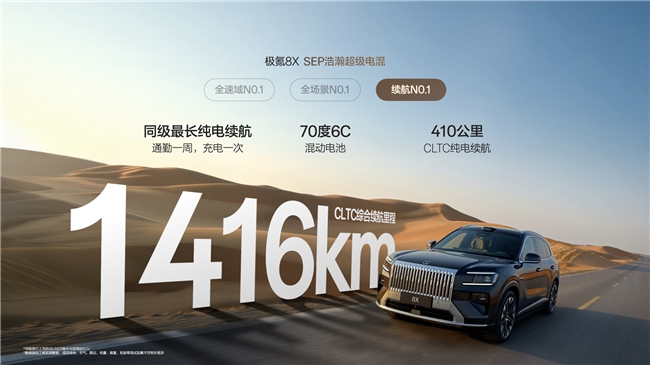续航是家庭自驾游的核心考量。极氪8X提供了三种电池方案,精准匹配不同家庭的使用场景。Max版和Ultra版搭载55度6C混动电池,CLTC综合续航1362公里,适合以城市通勤为主、周末偶尔出游的家庭。Ultra+版升级为70度6C混动电池,综合续航1416公里,专为频繁长途自驾的用户准备。曜影版同样搭载70度电池,在超1400匹马力的极致性能下仍保持超1200公里续航,证明了超级电混技术的强大实力。