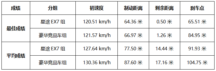 整场测试,星途EX7组取得了平均时速127.64km/h初始速度下,平均制动距离77.50m、剩余距离14.44m、刹车点91.93m的成绩。而豪华竞品组取得了平均130.36km/h初始速度下,平均制动距离87.60m、剩余距离17.16m、刹车点104.75m的成绩。