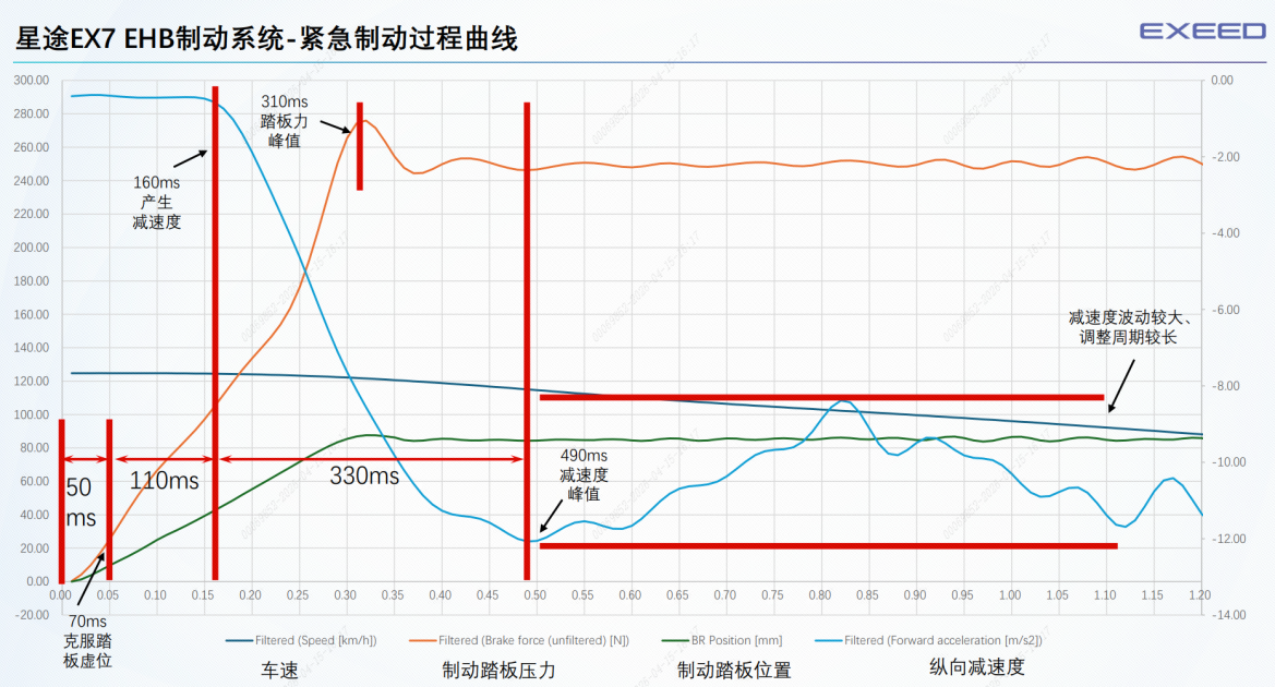 但传统制动测试更多是考查特性测试速度区间内的车辆行驶距离,即制动距离,未考虑刹车系统的反应速度,而真实世界中,前面突发事故,驾驶者踩下刹车,制动液在管路中建立压力,推动卡钳夹紧刹车盘,整套制动流程大约需要300-500ms的响应时间,在此期间车辆依然会高速前行,刹车系统反应速度快慢会影响整体制动成绩。