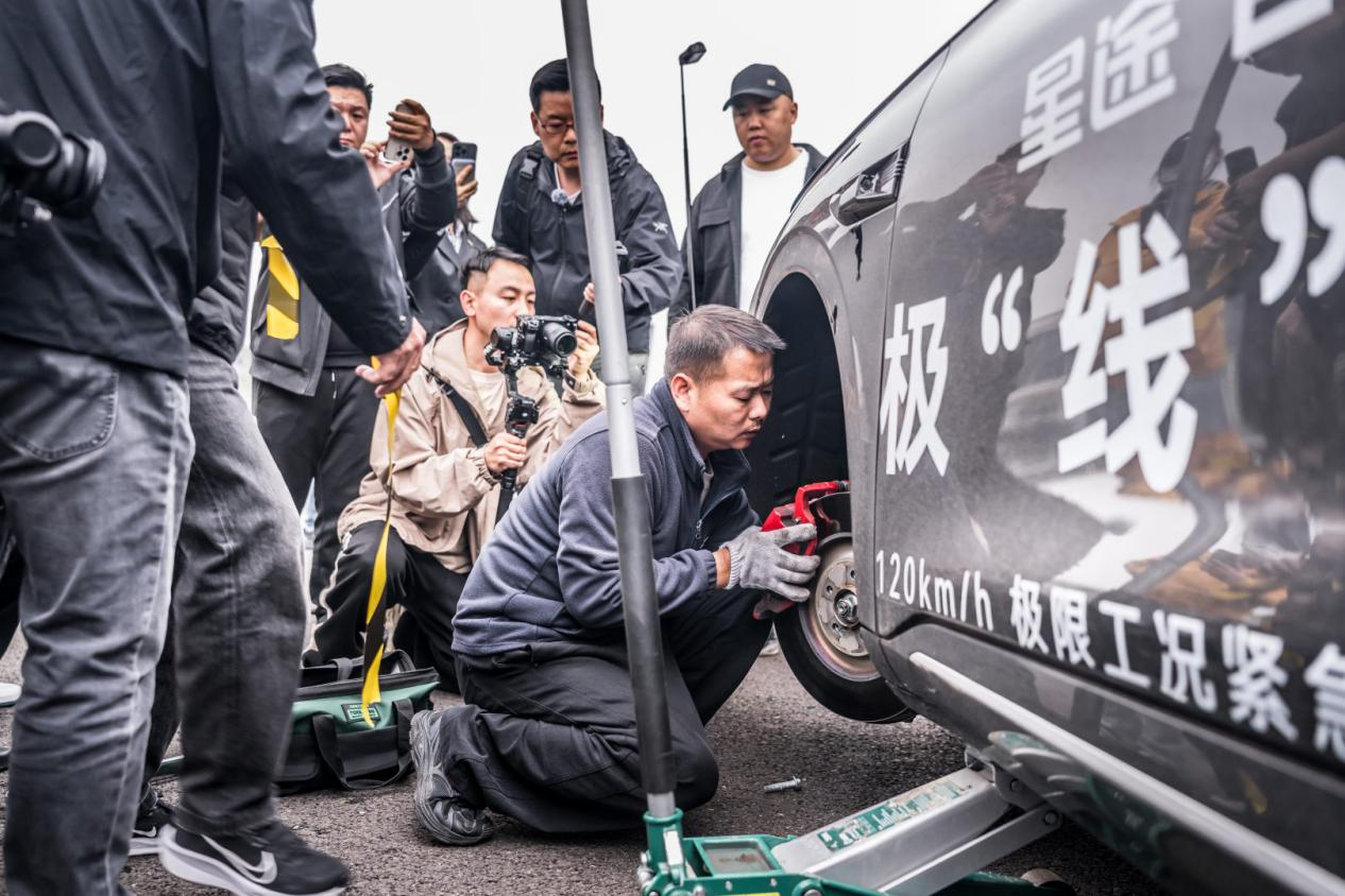 而在“绝境逢生”环节,则通过人工干预,致使星途EX7左前右后双轮爆胎、小电瓶断电,但星途EX7基于EMB极速响应+四轮独立制动能力,依然可以进行可控的120km/h紧急制动。“双轮制动”环节在拆除了左前右后制动卡钳,仅保留两个轮胎制动情况下,星途EX7依然可以实现大到0.5g的紧急制动能力,制动过程不甩尾,不失控,不偏出3.5米车道,平稳刹停,实现了人类汽车历史上首次极限突破。